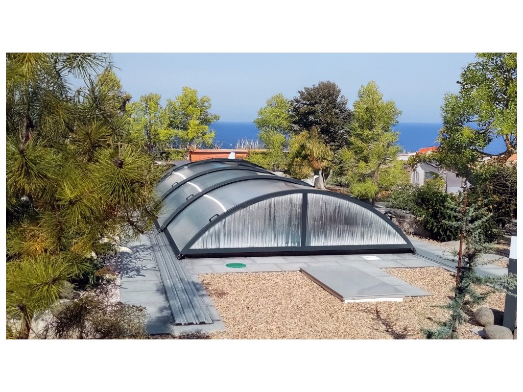 - Die mitgelieferten Schienen sind begehbar und werden um 245 cm verlängert, um die Überdachung vom Pool weg zu bewegen.