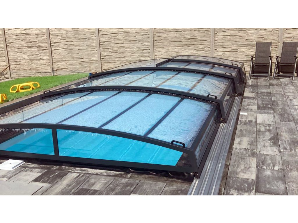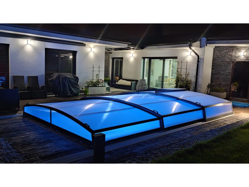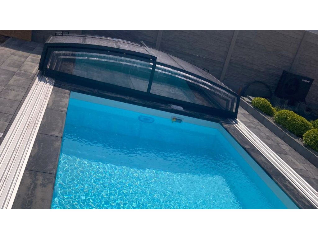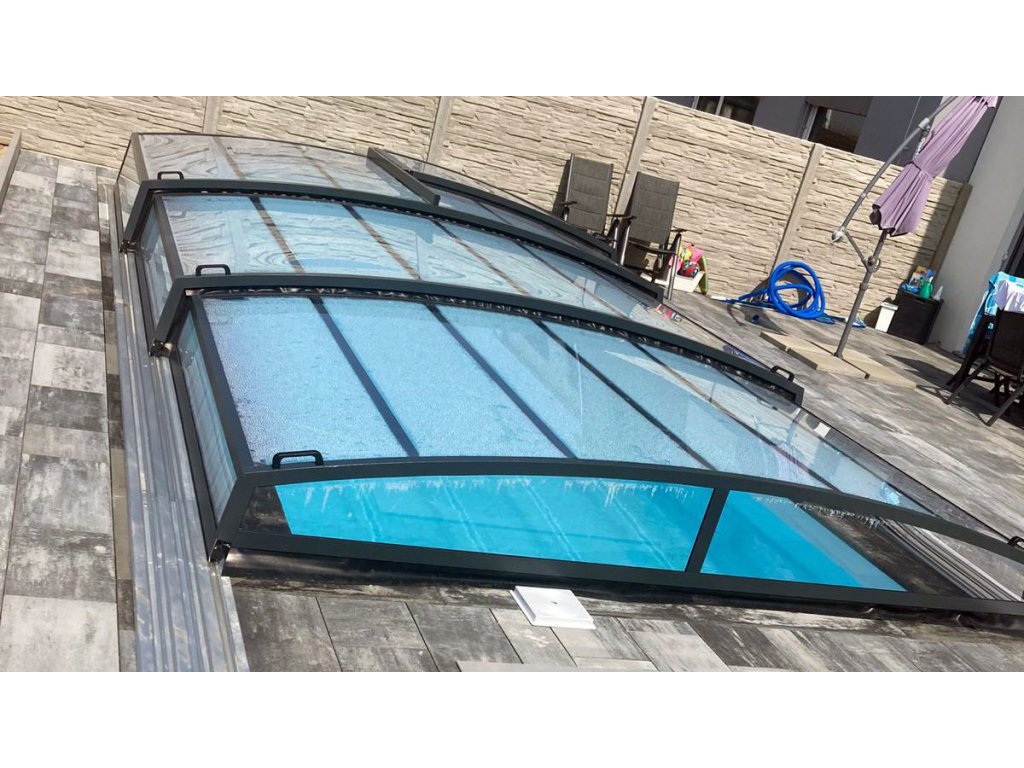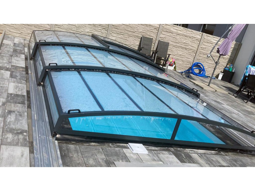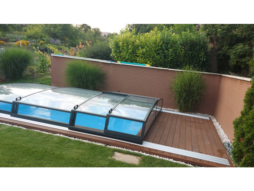 - Die mitgelieferten Schienen sind begehbar und werden um 220 cm verlängert, um die Überdachung vom Pool weg zu bewegen.