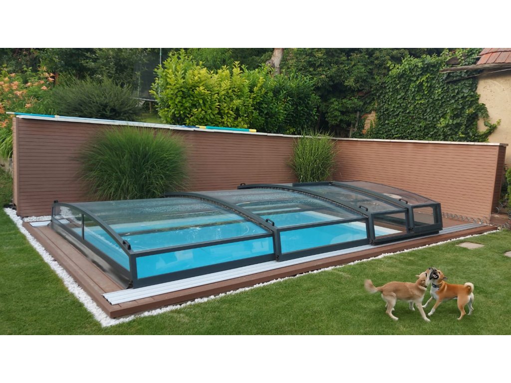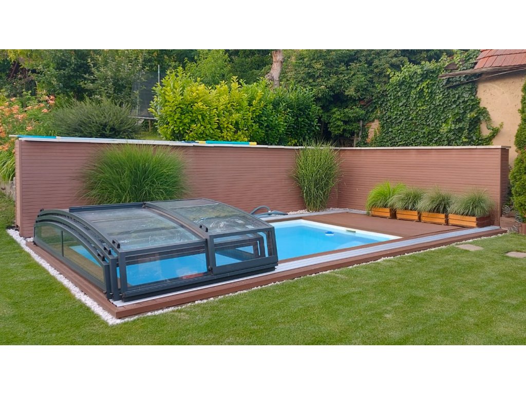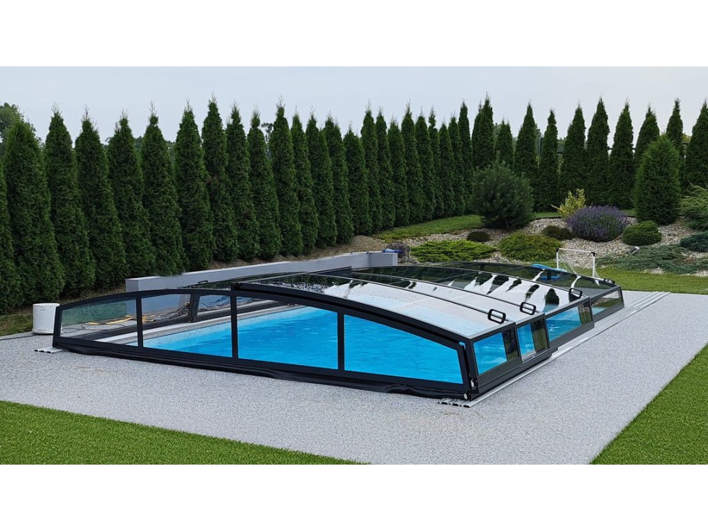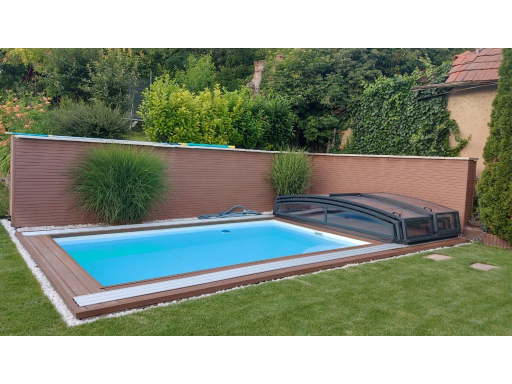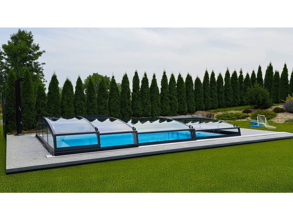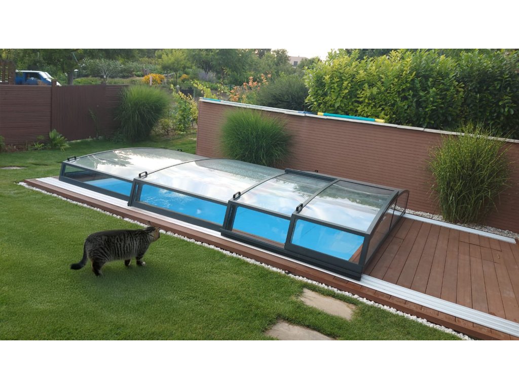 - Die mitgelieferten Schienen sind begehbar und werden um 220 cm verlängert, um die Überdachung vom Pool weg zu bewegen.