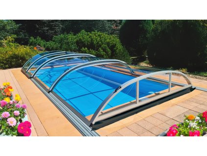 Die Poolüberdachung Sapphire gehört zu den beliebtesten Modellen – dank ihrer niedrigen Bauweise und des eleganten Designs. Gleichzeitig bietet sie ausreichend Platz, um bequem direkt unter der Überdachung zu schwimmen.